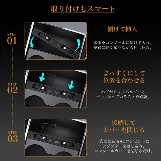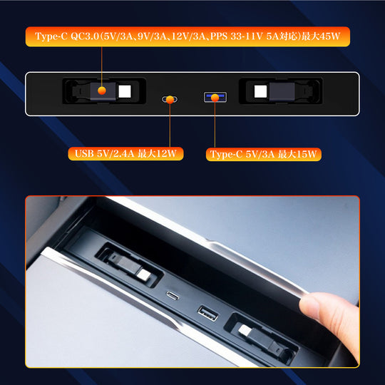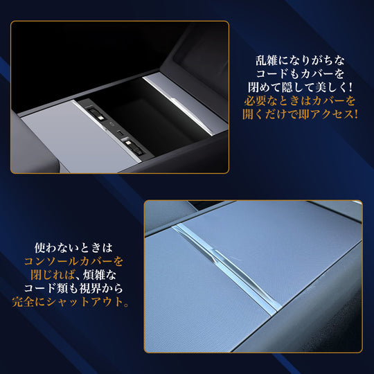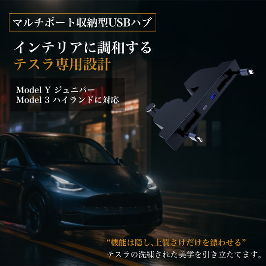 シームレスな収納でエレガントな車内を センターコンソールカバーを閉じるとUSBハブが見えなくなる設計を採用。Teslaの洗練されたインテリアに溶け込み、視覚的な調和を保ちながら、すっきりとした車内空間を実現します。 Model 3 / Yに完璧に調和する設計 新型Tesla Model 3 / Yの形状に合わせ、3Dスキャン技術で精密に設計。隙間やぐらつきのないフィット感は、純正アクセサリーのような一体感を提供し、長期間の使用にも安心です。 シガーソケット給電による安定性 シガーソケットからの直接給電により、安定した電力供給を確保。複数デバイスの同時充電でも出力が落ちず、長距離ドライブでも信頼性の高い性能を発揮します。 45W急速充電で時間を最適化 USB-CおよびUSB-Aポートを搭載し、最大45Wの急速充電に対応。スマートフォンやタブレットを効率的に充電し、移動中の時間を最大限に活用できます。 伸縮ケーブルとマグネット収納で快適 左右に1mの伸縮ケーブルを備え、助手席や後部座席からも容易にアクセス可能。マグネット収納によりケーブルをスマートに整理し、車内を常に整然と保ちます。通常価格 ¥4,980通常価格 ¥4,980