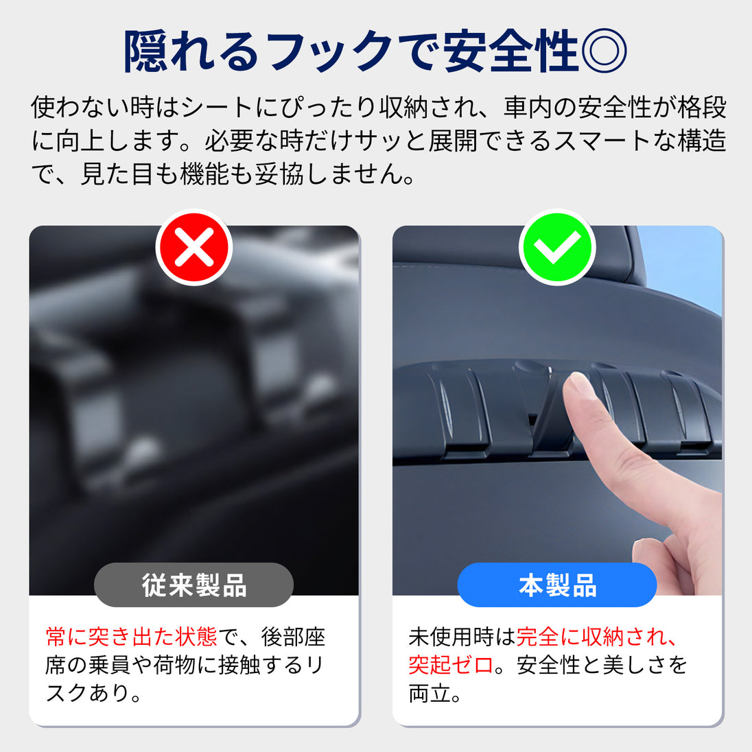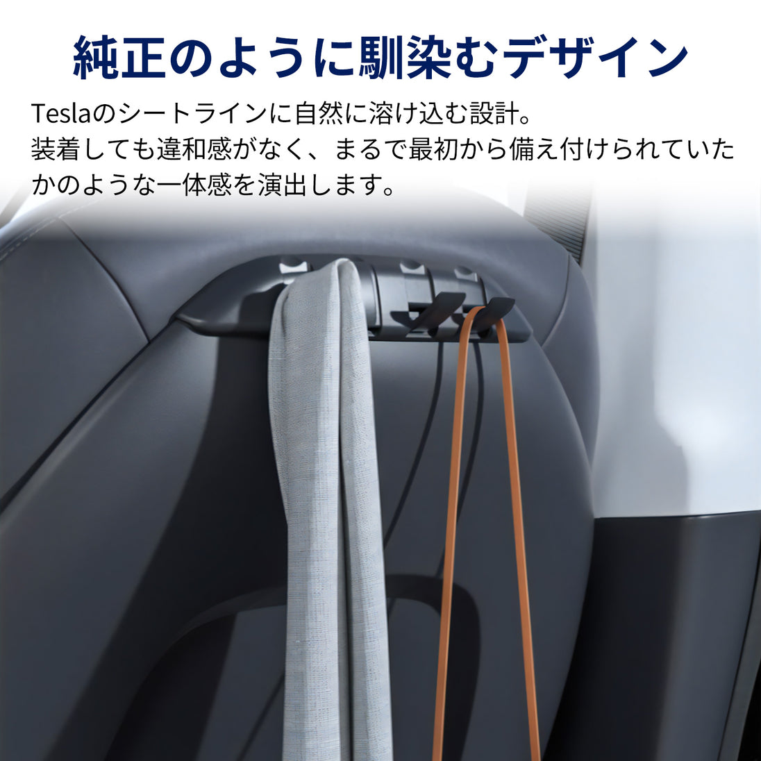 【隠れる折りたたみ式フック】必要な時だけ展開、使わない時はシートに一体化。視覚的なノイズを抑え、Tesla本来の美しさを保ちます。