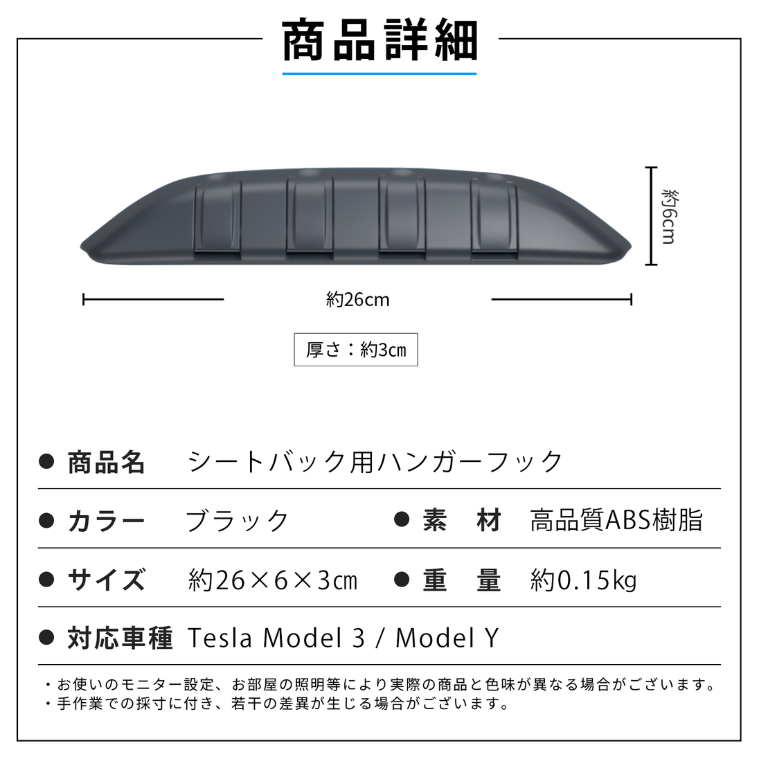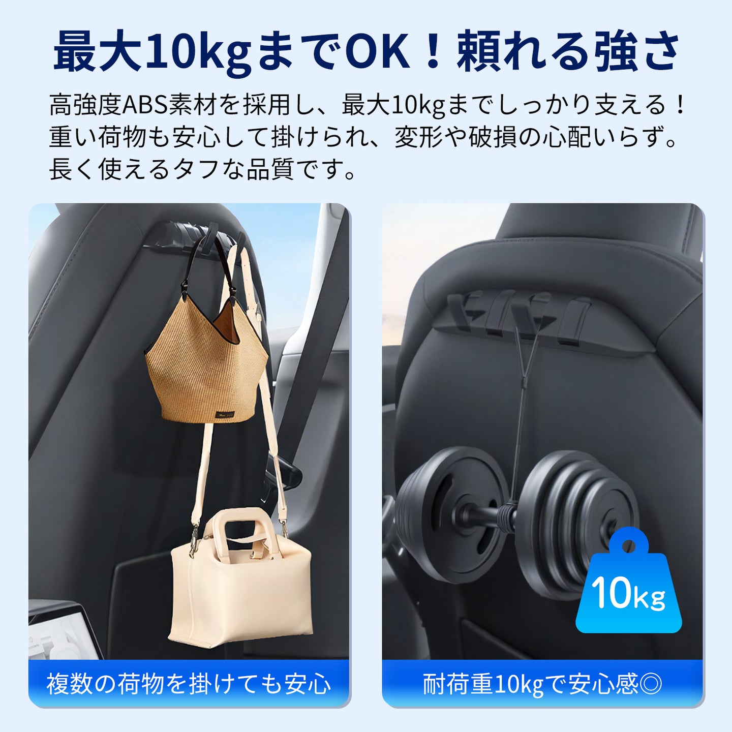 【高耐久ABS素材】耐熱性・耐久性に優れた高品質ABS樹脂を使用。最大10kgまで支え、重いバッグや荷物も安心して掛けられます。テープでの取り付けではないので、ルーフガラスからの暑い直射日光でも取れることなく安心。