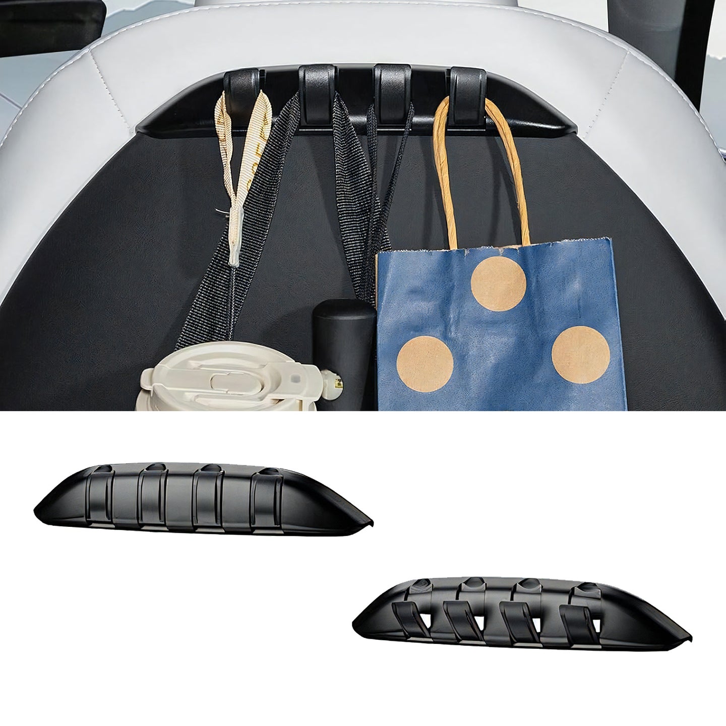 【4-in-1多機能設計】1つのベースに4つの独立フックを搭載。バッグ、買い物袋、ジャケット、傘などをスマートに整理し、上質な車内空間を維持します。