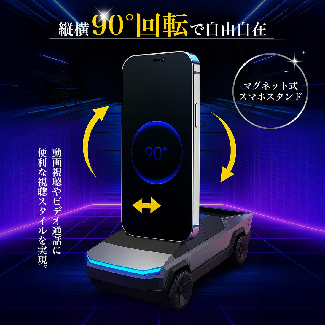 マグネット式スマホスタンド:縦横自由に90°回転可能、動画視聴やビデオ通話にも最適。